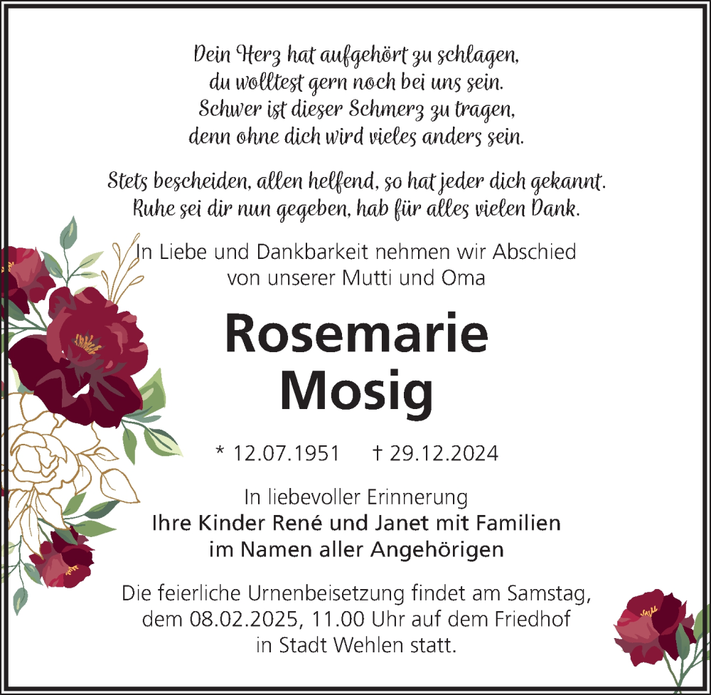 Hier finden Sie alle Traueranzeigen aus der Zeitung, die bisher für Rosemarie Mosig erschienen sind. Weitere Traueranzeigen, die in der Zeitung erscheinen, werden hier ebenfalls aufgelistet