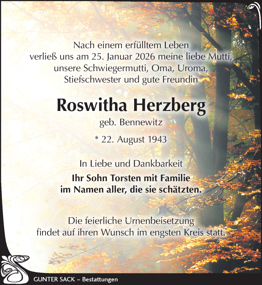 Hier finden Sie alle Traueranzeigen aus der Zeitung, die bisher für Roswitha Herzberg erschienen sind. Weitere Traueranzeigen, die in der Zeitung erscheinen, werden hier ebenfalls aufgelistet