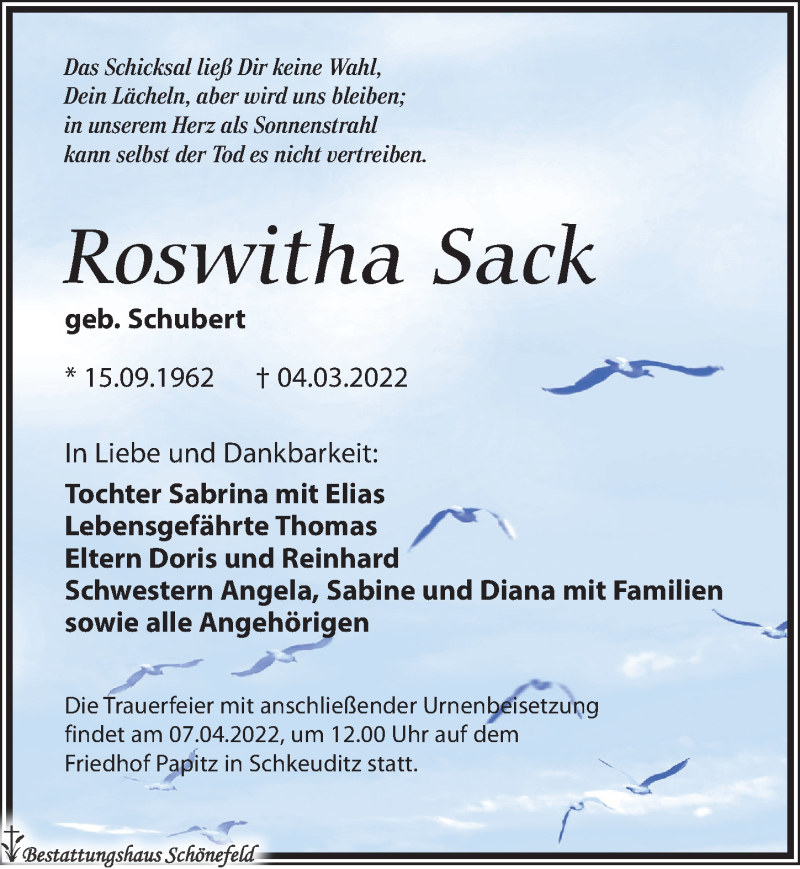 Hier finden Sie alle Traueranzeigen aus der Zeitung, die bisher für Roswitha Sack erschienen sind. Weitere Traueranzeigen, die in der Zeitung erscheinen, werden hier ebenfalls aufgelistet