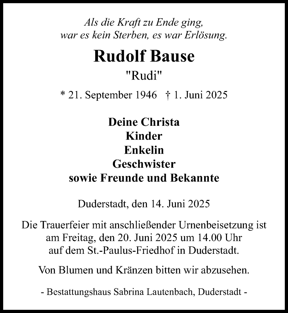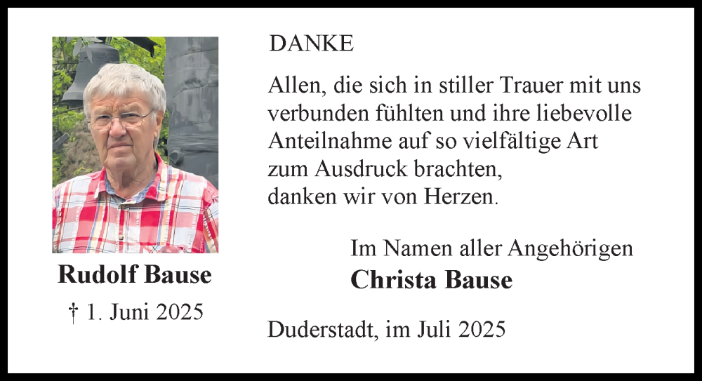 Hier finden Sie alle Traueranzeigen aus der Zeitung, die bisher für Rudolf Bause erschienen sind. Weitere Traueranzeigen, die in der Zeitung erscheinen, werden hier ebenfalls aufgelistet