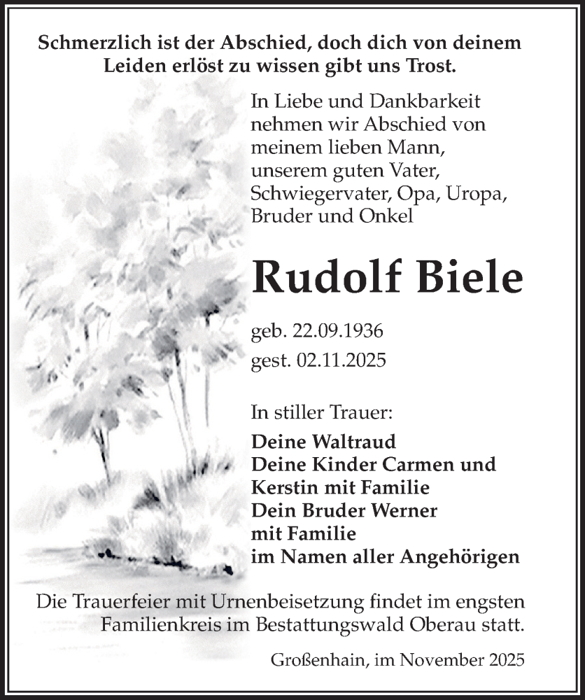 Hier finden Sie alle Traueranzeigen aus der Zeitung, die bisher für Rudolf Biele erschienen sind. Weitere Traueranzeigen, die in der Zeitung erscheinen, werden hier ebenfalls aufgelistet