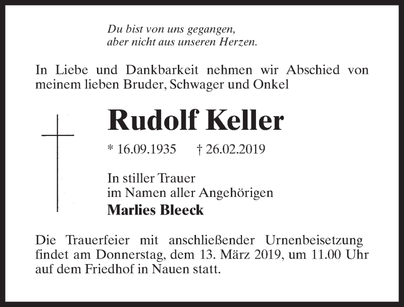 Hier finden Sie alle Traueranzeigen aus der Zeitung, die bisher für Rudolf Keller erschienen sind. Weitere Traueranzeigen, die in der Zeitung erscheinen, werden hier ebenfalls aufgelistet