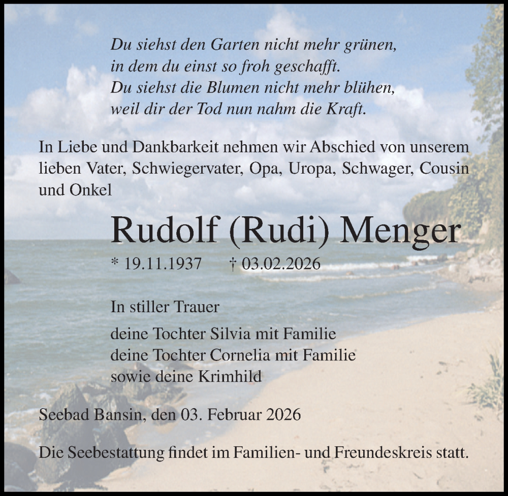 Hier finden Sie alle Traueranzeigen aus der Zeitung, die bisher für Rudolf Menger erschienen sind. Weitere Traueranzeigen, die in der Zeitung erscheinen, werden hier ebenfalls aufgelistet