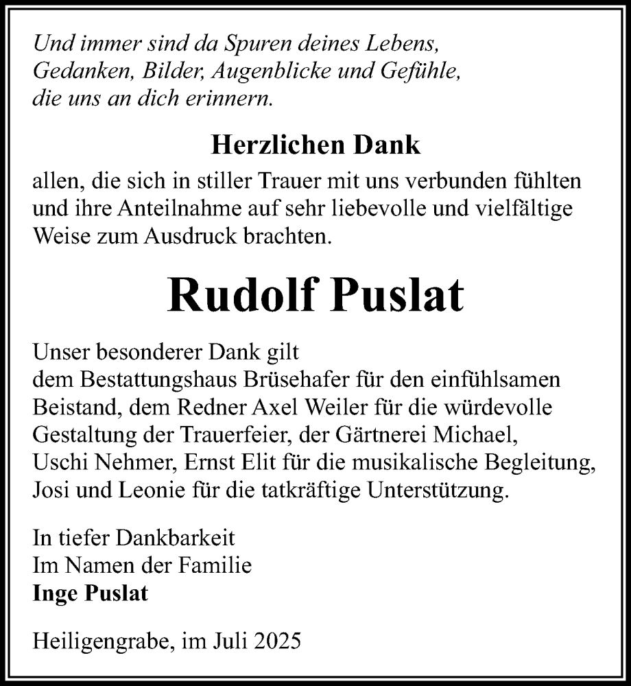 Hier finden Sie alle Traueranzeigen aus der Zeitung, die bisher für Rudolf Puslat erschienen sind. Weitere Traueranzeigen, die in der Zeitung erscheinen, werden hier ebenfalls aufgelistet