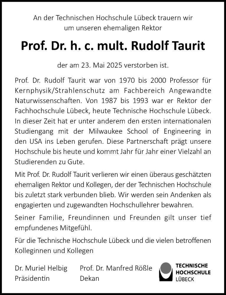 Hier finden Sie alle Traueranzeigen aus der Zeitung, die bisher für Rudolf Taurit erschienen sind. Weitere Traueranzeigen, die in der Zeitung erscheinen, werden hier ebenfalls aufgelistet