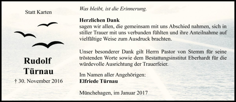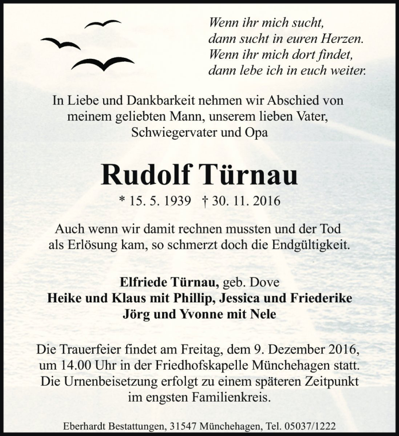 Hier finden Sie alle Traueranzeigen aus der Zeitung, die bisher für Rudolf Türnau erschienen sind. Weitere Traueranzeigen, die in der Zeitung erscheinen, werden hier ebenfalls aufgelistet