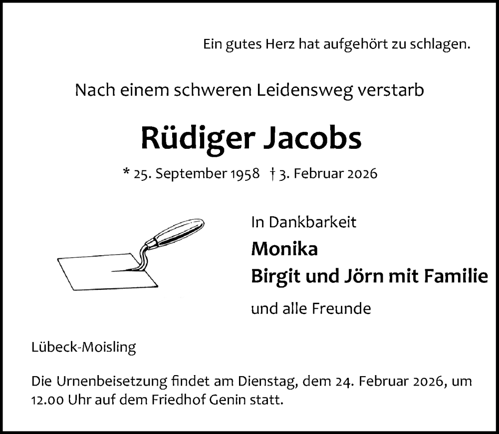 Hier finden Sie alle Traueranzeigen aus der Zeitung, die bisher für Rüdiger Jacobs erschienen sind. Weitere Traueranzeigen, die in der Zeitung erscheinen, werden hier ebenfalls aufgelistet