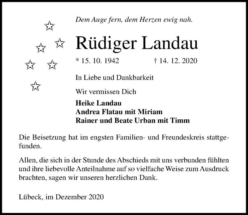 Hier finden Sie alle Traueranzeigen aus der Zeitung, die bisher für Rüdiger Landau erschienen sind. Weitere Traueranzeigen, die in der Zeitung erscheinen, werden hier ebenfalls aufgelistet