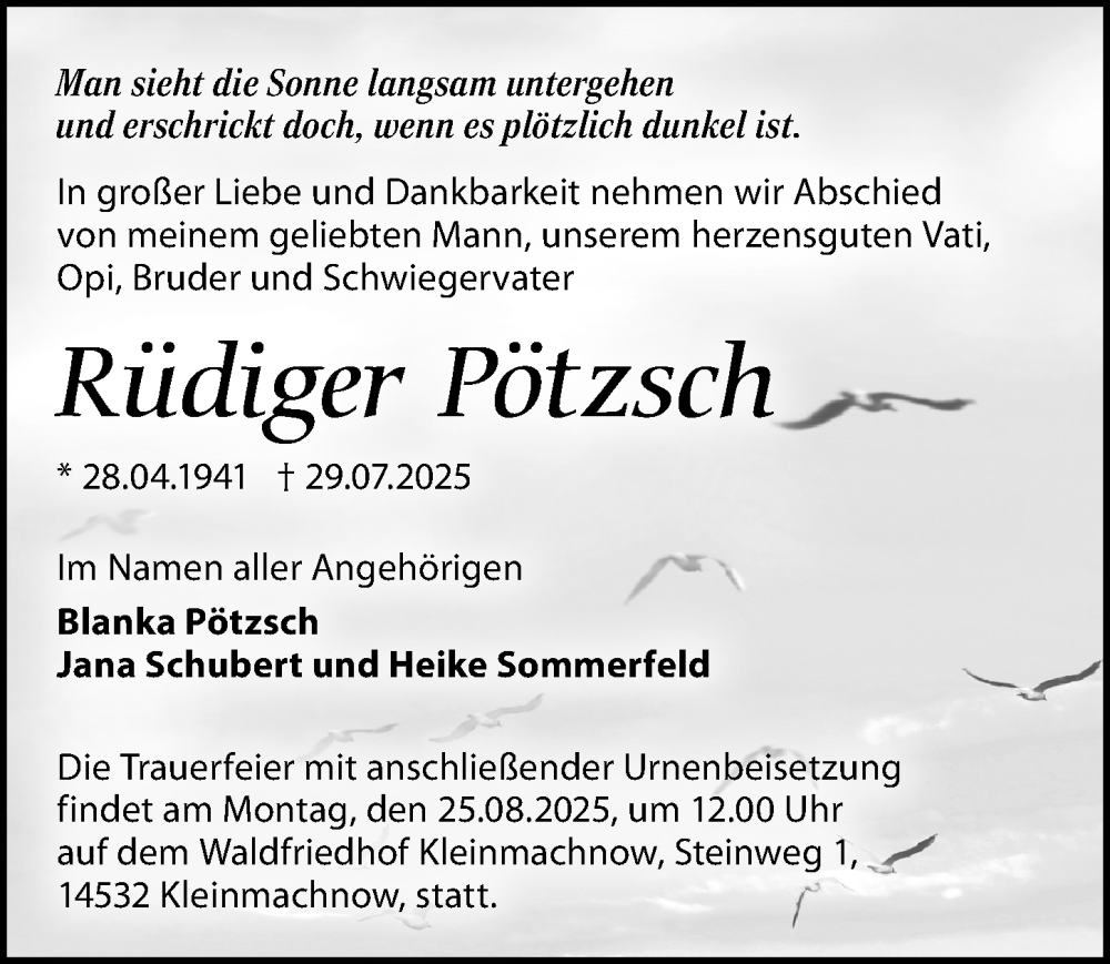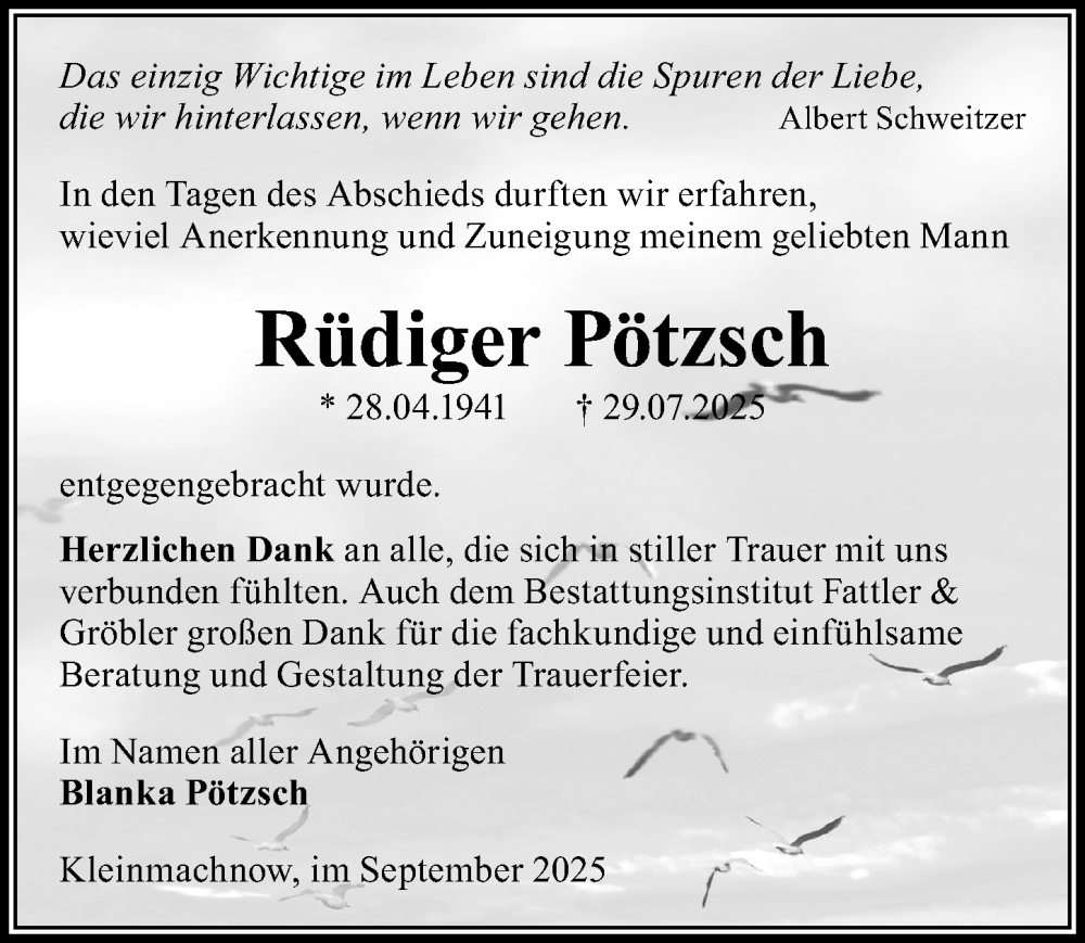 Hier finden Sie alle Traueranzeigen aus der Zeitung, die bisher für Rüdiger Pötzsch erschienen sind. Weitere Traueranzeigen, die in der Zeitung erscheinen, werden hier ebenfalls aufgelistet