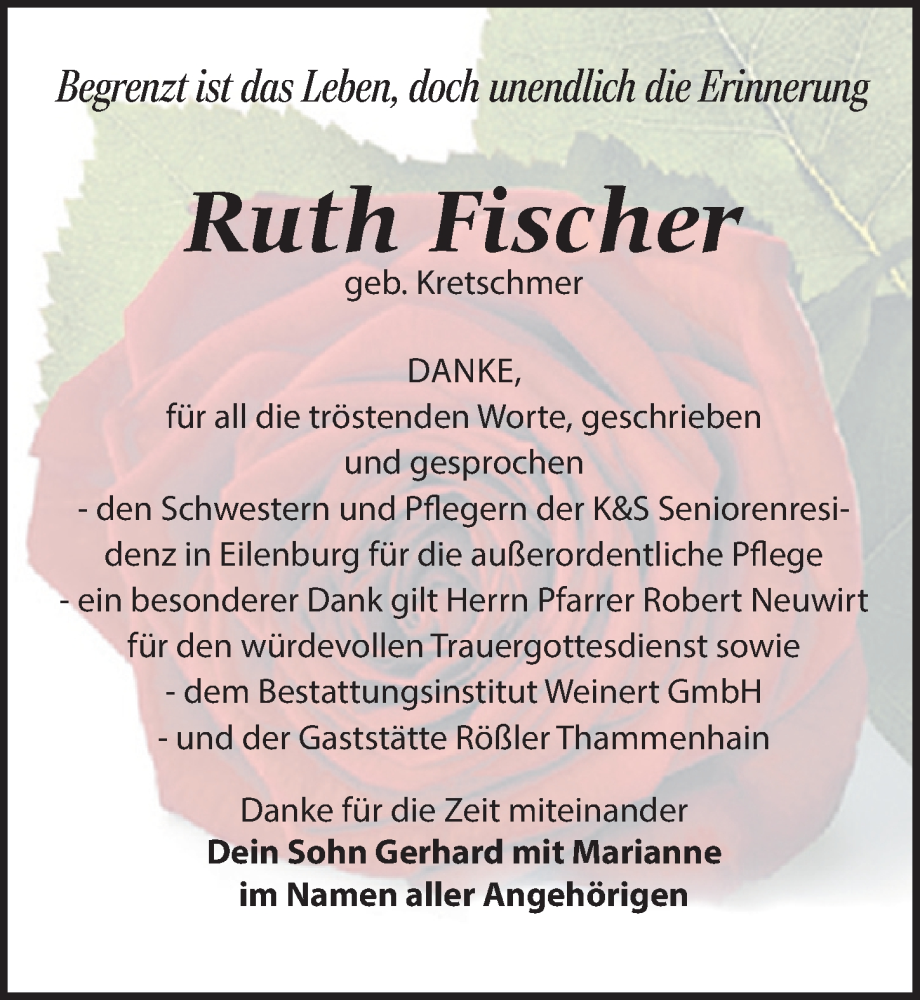 Hier finden Sie alle Traueranzeigen aus der Zeitung, die bisher für Ruth Fischer erschienen sind. Weitere Traueranzeigen, die in der Zeitung erscheinen, werden hier ebenfalls aufgelistet
