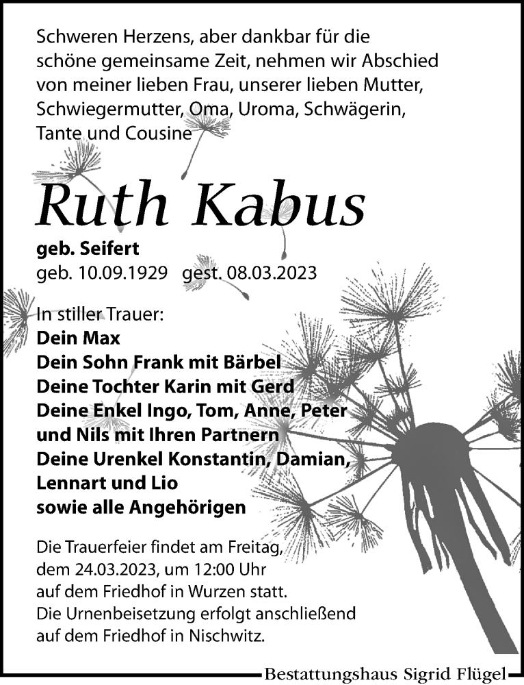 Hier finden Sie alle Traueranzeigen aus der Zeitung, die bisher für Ruth Kabus erschienen sind. Weitere Traueranzeigen, die in der Zeitung erscheinen, werden hier ebenfalls aufgelistet