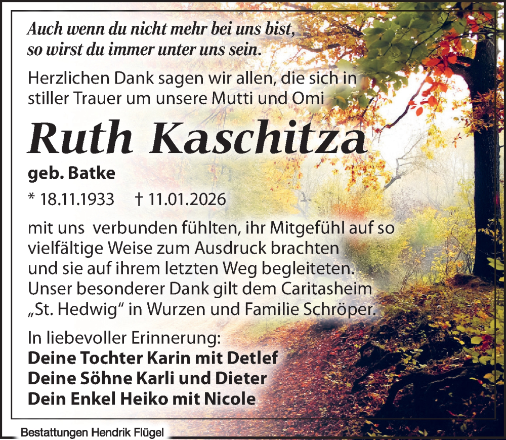 Hier finden Sie alle Traueranzeigen aus der Zeitung, die bisher für Ruth Kaschitza erschienen sind. Weitere Traueranzeigen, die in der Zeitung erscheinen, werden hier ebenfalls aufgelistet