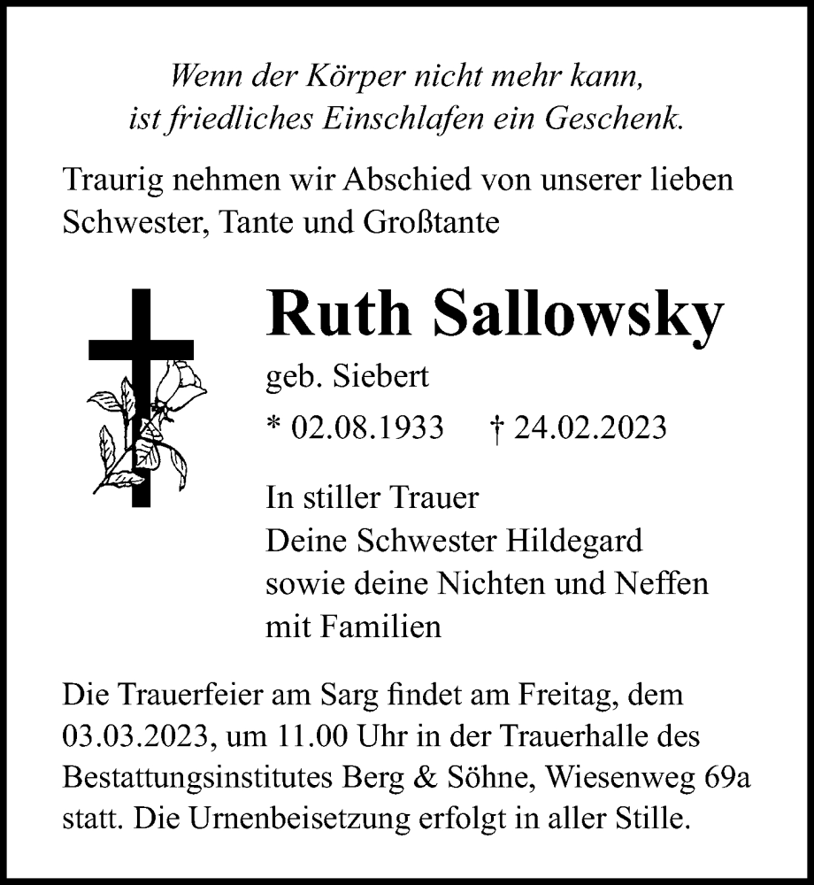 Hier finden Sie alle Traueranzeigen aus der Zeitung, die bisher für Ruth Sallowsky erschienen sind. Weitere Traueranzeigen, die in der Zeitung erscheinen, werden hier ebenfalls aufgelistet