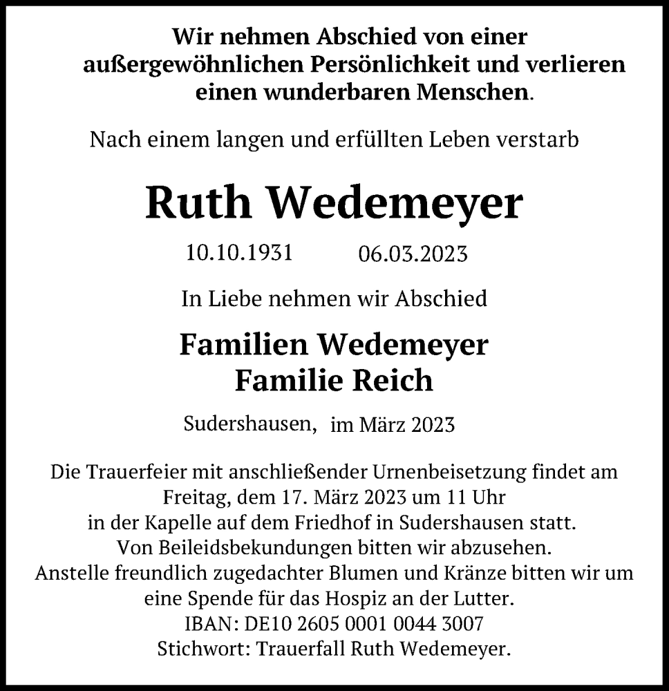 Hier finden Sie alle Traueranzeigen aus der Zeitung, die bisher für Ruth Wedemeyer erschienen sind. Weitere Traueranzeigen, die in der Zeitung erscheinen, werden hier ebenfalls aufgelistet
