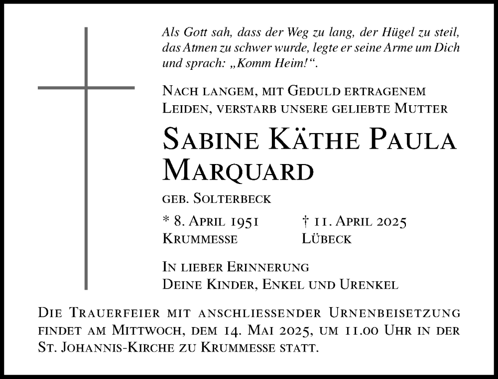 Hier finden Sie alle Traueranzeigen aus der Zeitung, die bisher für Sabine Käthe Paula Marquard erschienen sind. Weitere Traueranzeigen, die in der Zeitung erscheinen, werden hier ebenfalls aufgelistet
