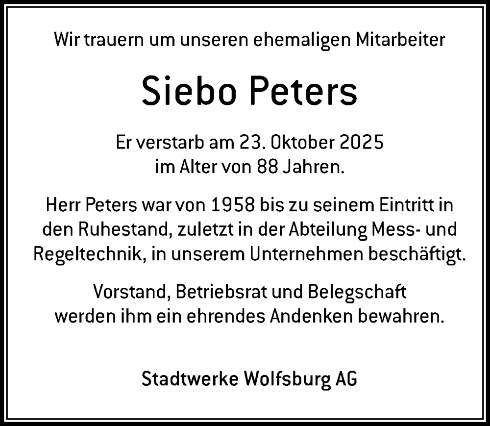 Hier finden Sie alle Traueranzeigen aus der Zeitung, die bisher für Siebo Peters erschienen sind. Weitere Traueranzeigen, die in der Zeitung erscheinen, werden hier ebenfalls aufgelistet