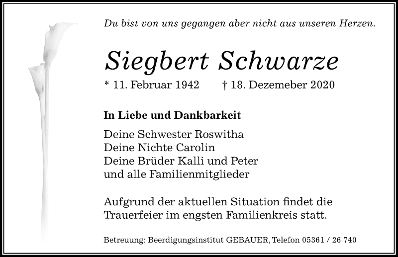 Hier finden Sie alle Traueranzeigen aus der Zeitung, die bisher für Siegbert Schwarze erschienen sind. Weitere Traueranzeigen, die in der Zeitung erscheinen, werden hier ebenfalls aufgelistet