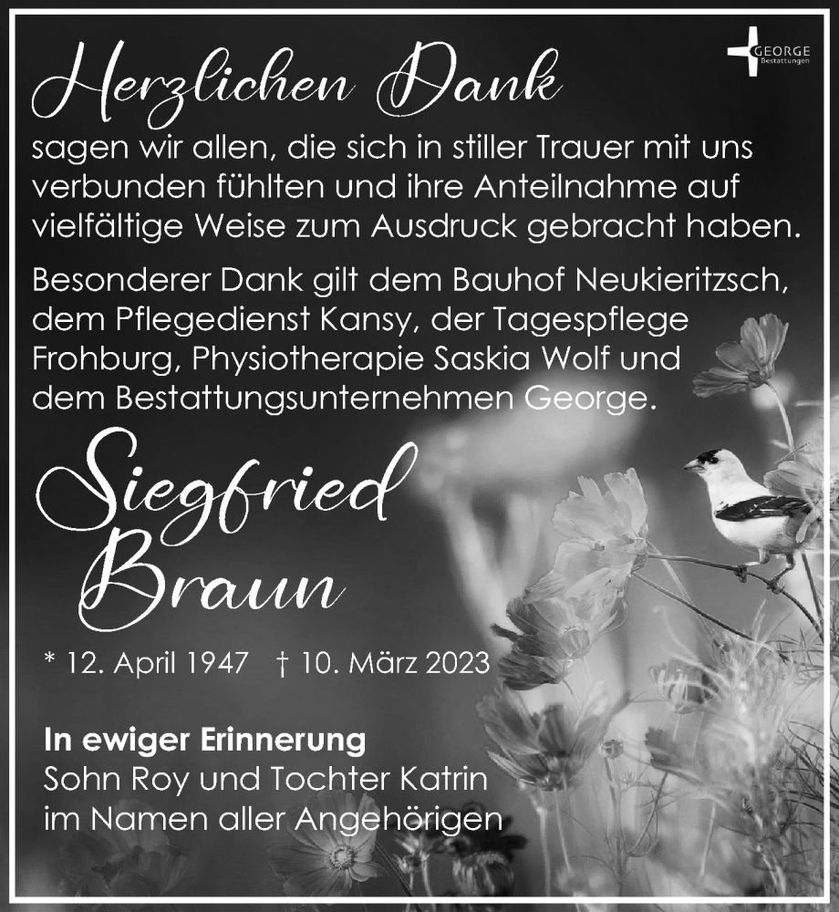 Hier finden Sie alle Traueranzeigen aus der Zeitung, die bisher für Siegfried Braun erschienen sind. Weitere Traueranzeigen, die in der Zeitung erscheinen, werden hier ebenfalls aufgelistet