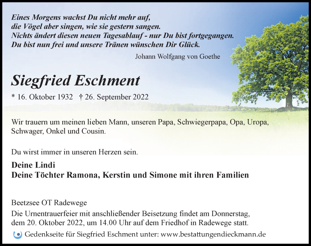 Hier finden Sie alle Traueranzeigen aus der Zeitung, die bisher für Siegfried Eschment erschienen sind. Weitere Traueranzeigen, die in der Zeitung erscheinen, werden hier ebenfalls aufgelistet