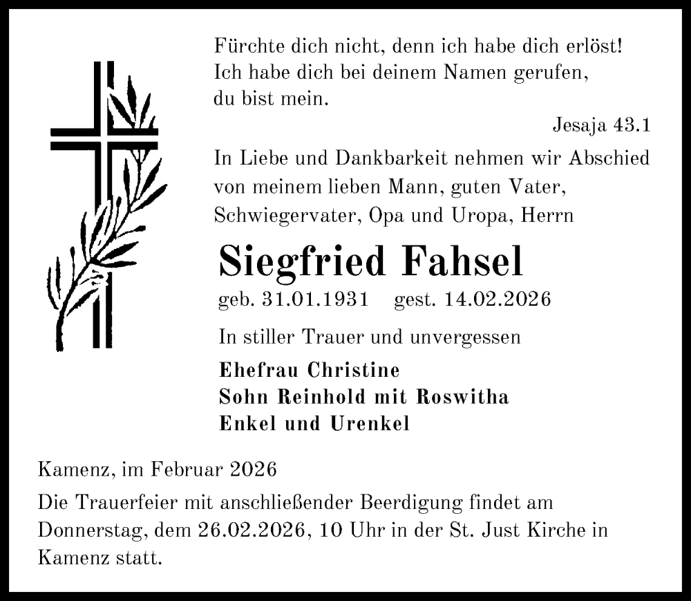 Hier finden Sie alle Traueranzeigen aus der Zeitung, die bisher für Siegfried Fahsel erschienen sind. Weitere Traueranzeigen, die in der Zeitung erscheinen, werden hier ebenfalls aufgelistet