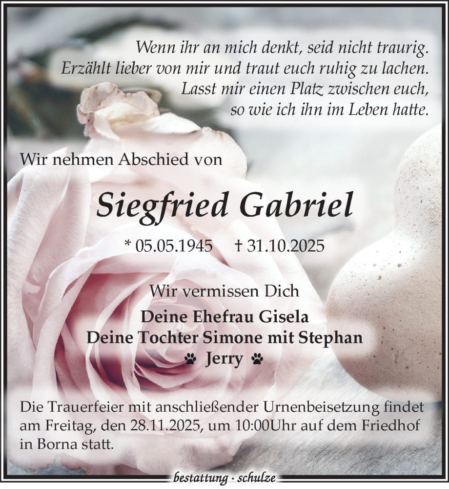 Hier finden Sie alle Traueranzeigen aus der Zeitung, die bisher für Siegfried Gabriel erschienen sind. Weitere Traueranzeigen, die in der Zeitung erscheinen, werden hier ebenfalls aufgelistet
