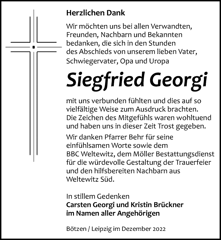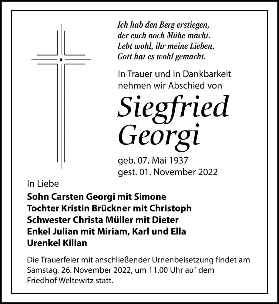 Hier finden Sie alle Traueranzeigen aus der Zeitung, die bisher für Siegfried Georgi erschienen sind. Weitere Traueranzeigen, die in der Zeitung erscheinen, werden hier ebenfalls aufgelistet