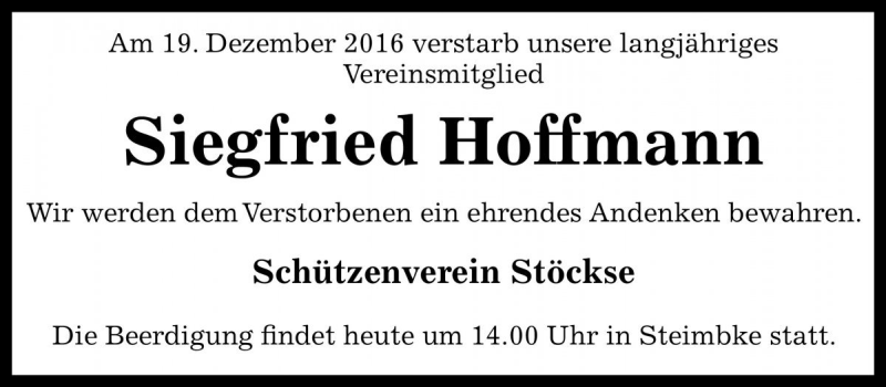 Hier finden Sie alle Traueranzeigen aus der Zeitung, die bisher für Siegfried Hoffmann erschienen sind. Weitere Traueranzeigen, die in der Zeitung erscheinen, werden hier ebenfalls aufgelistet