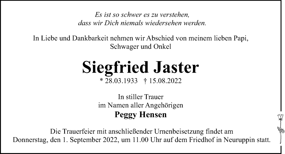 Hier finden Sie alle Traueranzeigen aus der Zeitung, die bisher für Siegfried Jaster erschienen sind. Weitere Traueranzeigen, die in der Zeitung erscheinen, werden hier ebenfalls aufgelistet