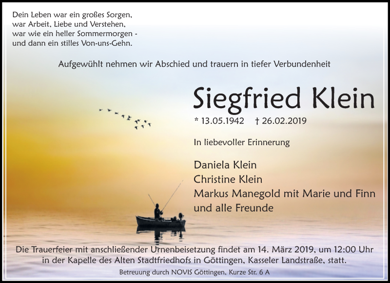 Hier finden Sie alle Traueranzeigen aus der Zeitung, die bisher für Siegfried Klein erschienen sind. Weitere Traueranzeigen, die in der Zeitung erscheinen, werden hier ebenfalls aufgelistet