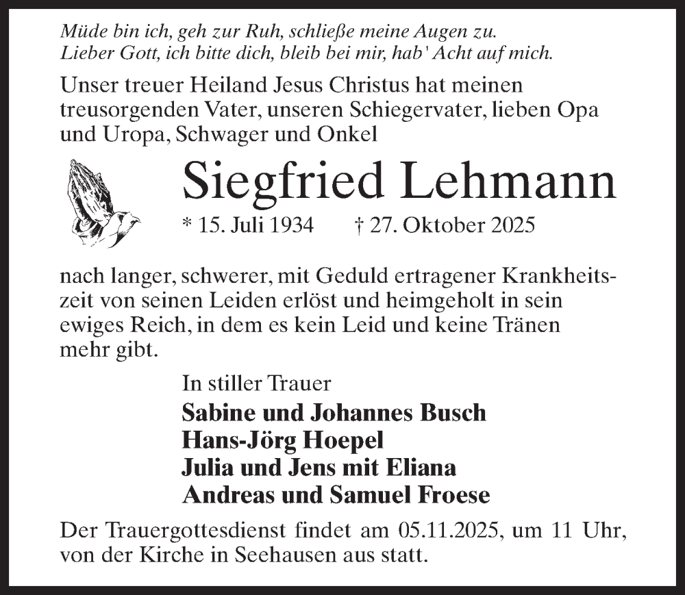 Hier finden Sie alle Traueranzeigen aus der Zeitung, die bisher für Siegfried Lehmann erschienen sind. Weitere Traueranzeigen, die in der Zeitung erscheinen, werden hier ebenfalls aufgelistet