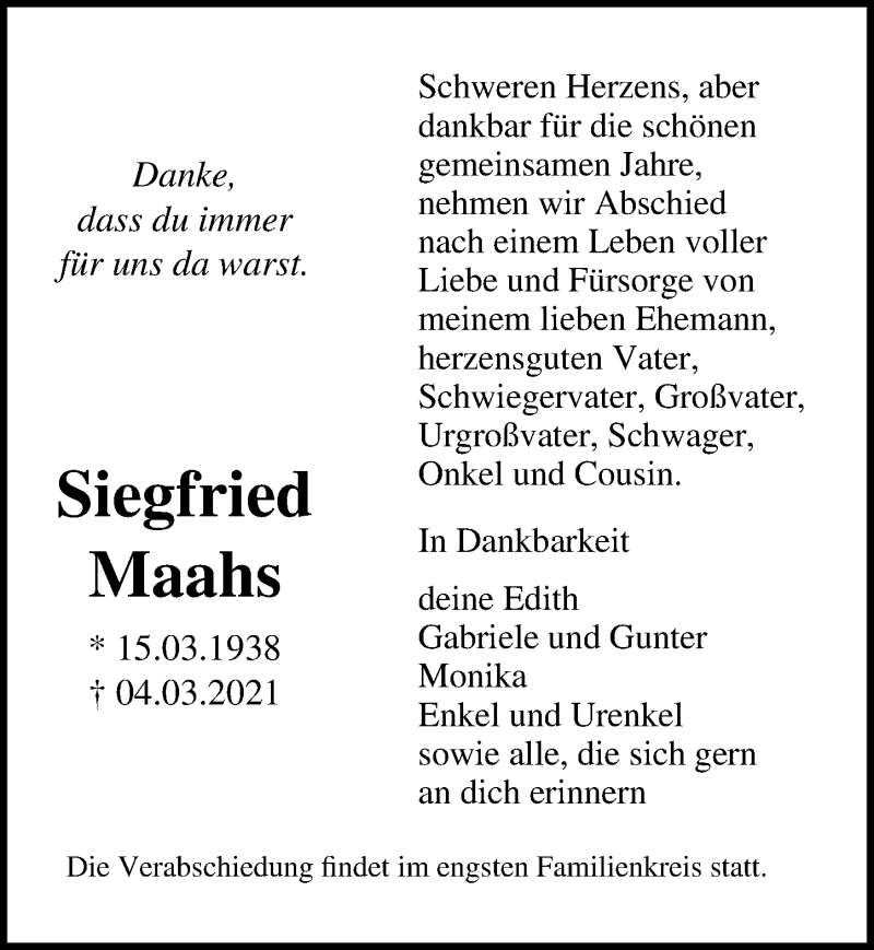 Hier finden Sie alle Traueranzeigen aus der Zeitung, die bisher für Siegfried Maahs erschienen sind. Weitere Traueranzeigen, die in der Zeitung erscheinen, werden hier ebenfalls aufgelistet