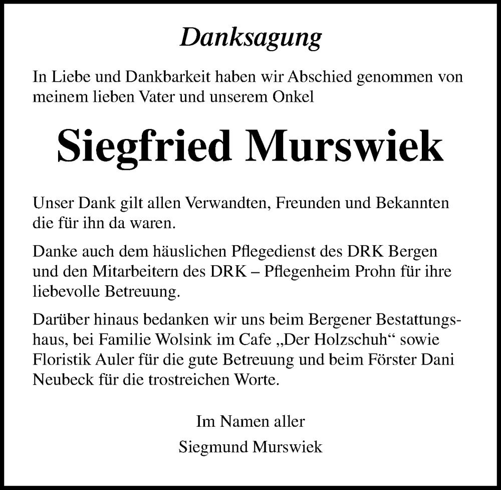 Hier finden Sie alle Traueranzeigen aus der Zeitung, die bisher für Siegfried Murswiek erschienen sind. Weitere Traueranzeigen, die in der Zeitung erscheinen, werden hier ebenfalls aufgelistet