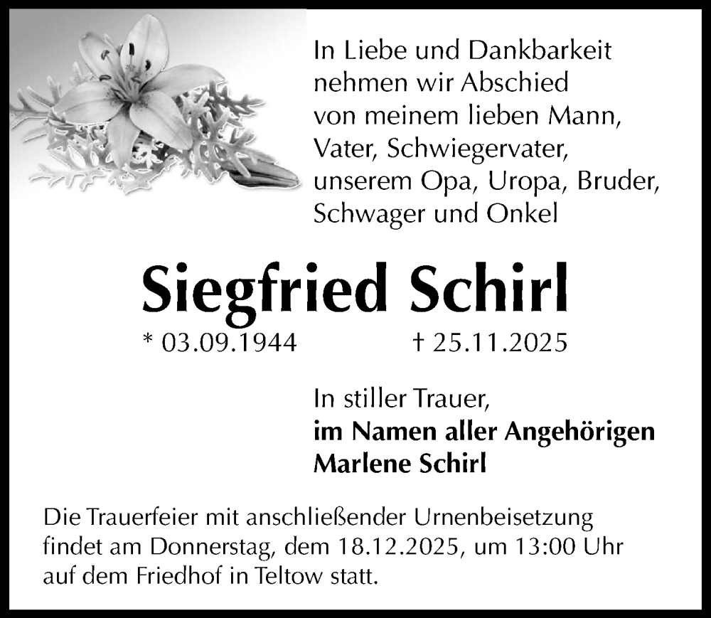 Hier finden Sie alle Traueranzeigen aus der Zeitung, die bisher für Siegfried Schirl erschienen sind. Weitere Traueranzeigen, die in der Zeitung erscheinen, werden hier ebenfalls aufgelistet