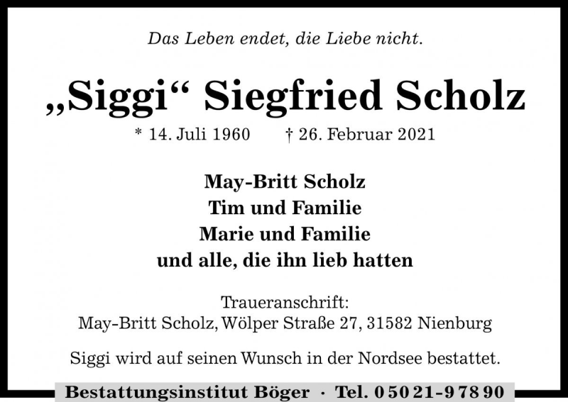 Hier finden Sie alle Traueranzeigen aus der Zeitung, die bisher für Siegfried Scholz erschienen sind. Weitere Traueranzeigen, die in der Zeitung erscheinen, werden hier ebenfalls aufgelistet