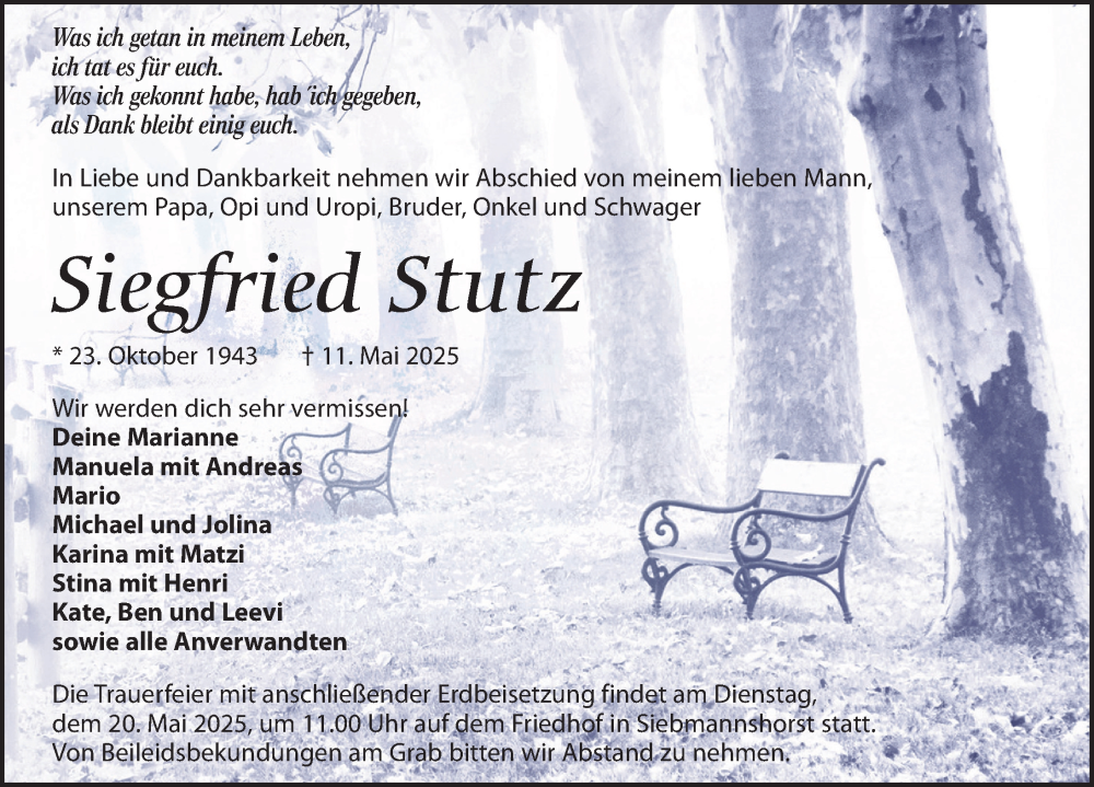 Hier finden Sie alle Traueranzeigen aus der Zeitung, die bisher für Siegfried Stutz erschienen sind. Weitere Traueranzeigen, die in der Zeitung erscheinen, werden hier ebenfalls aufgelistet