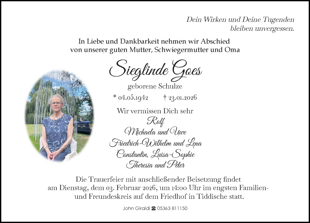 Hier finden Sie alle Traueranzeigen aus der Zeitung, die bisher für Sieglinde Goes erschienen sind. Weitere Traueranzeigen, die in der Zeitung erscheinen, werden hier ebenfalls aufgelistet