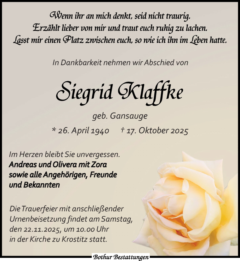 Hier finden Sie alle Traueranzeigen aus der Zeitung, die bisher für Siegrid Klaffke erschienen sind. Weitere Traueranzeigen, die in der Zeitung erscheinen, werden hier ebenfalls aufgelistet