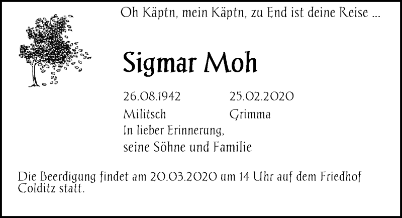 Hier finden Sie alle Traueranzeigen aus der Zeitung, die bisher für Sigmar Moh erschienen sind. Weitere Traueranzeigen, die in der Zeitung erscheinen, werden hier ebenfalls aufgelistet