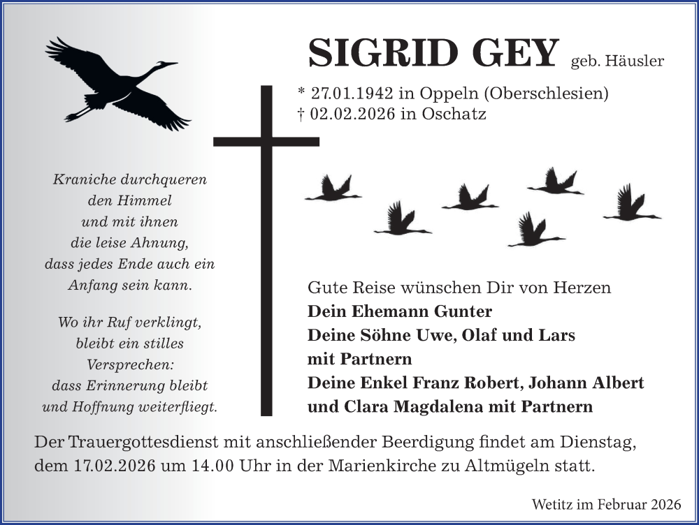 Hier finden Sie alle Traueranzeigen aus der Zeitung, die bisher für Sigrid Gey erschienen sind. Weitere Traueranzeigen, die in der Zeitung erscheinen, werden hier ebenfalls aufgelistet