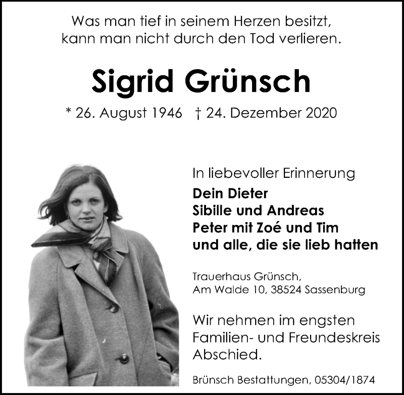 Hier finden Sie alle Traueranzeigen aus der Zeitung, die bisher für Sigrid Grünsch erschienen sind. Weitere Traueranzeigen, die in der Zeitung erscheinen, werden hier ebenfalls aufgelistet