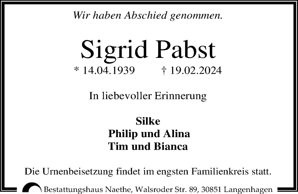Hier finden Sie alle Traueranzeigen aus der Zeitung, die bisher für Sigrid Pabst erschienen sind. Weitere Traueranzeigen, die in der Zeitung erscheinen, werden hier ebenfalls aufgelistet