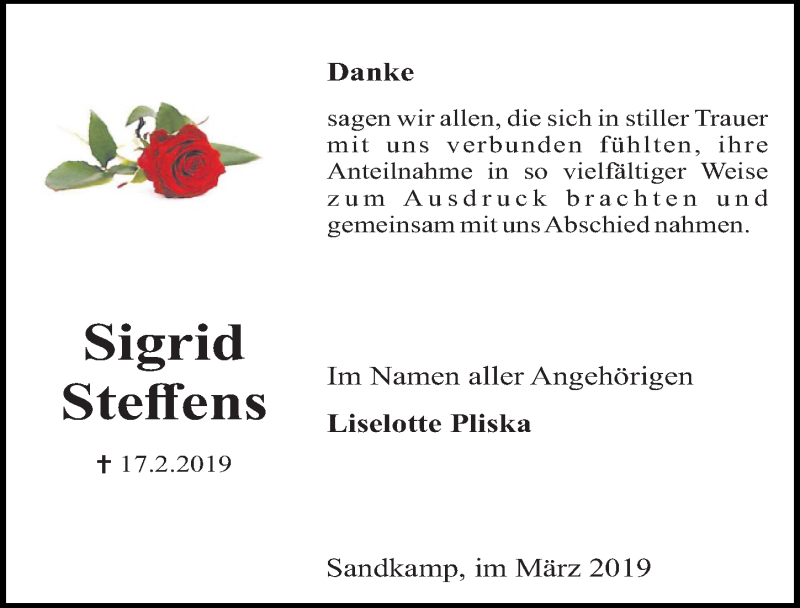 Hier finden Sie alle Traueranzeigen aus der Zeitung, die bisher für Sigrid Steffens erschienen sind. Weitere Traueranzeigen, die in der Zeitung erscheinen, werden hier ebenfalls aufgelistet
