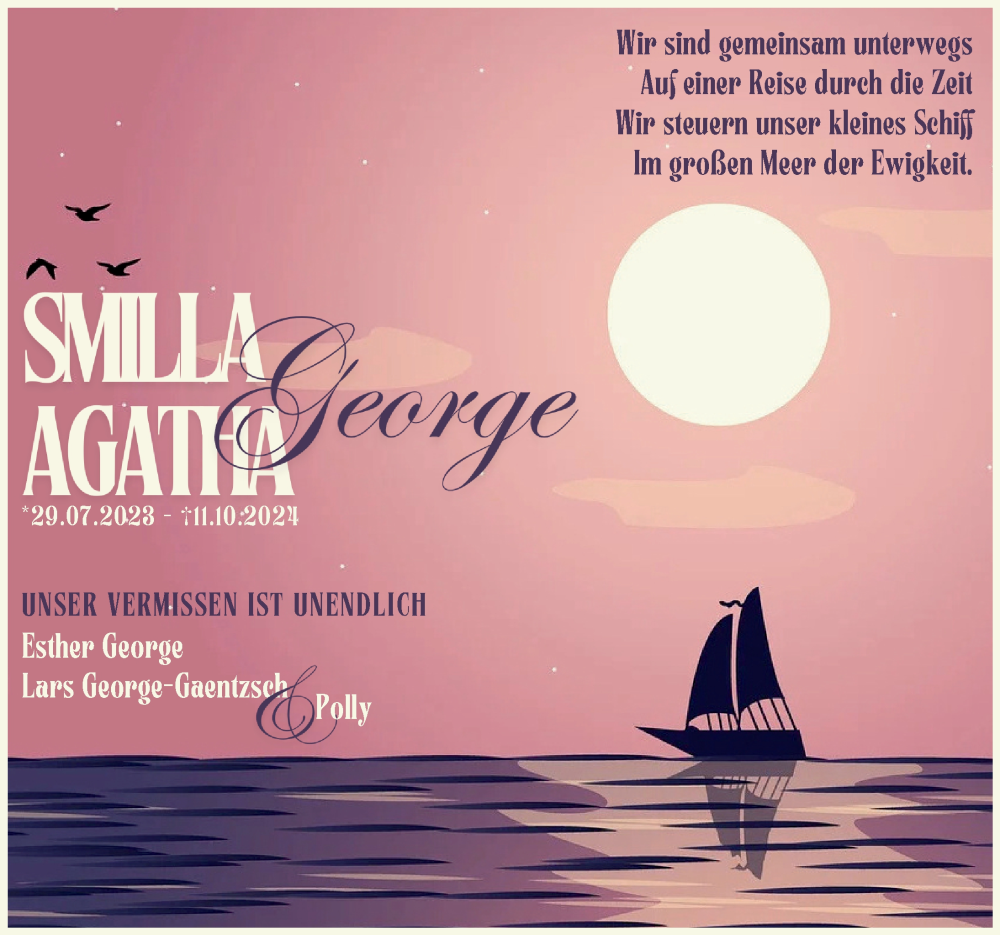 Hier finden Sie alle Traueranzeigen aus der Zeitung, die bisher für Smilla Agatha George erschienen sind. Weitere Traueranzeigen, die in der Zeitung erscheinen, werden hier ebenfalls aufgelistet
