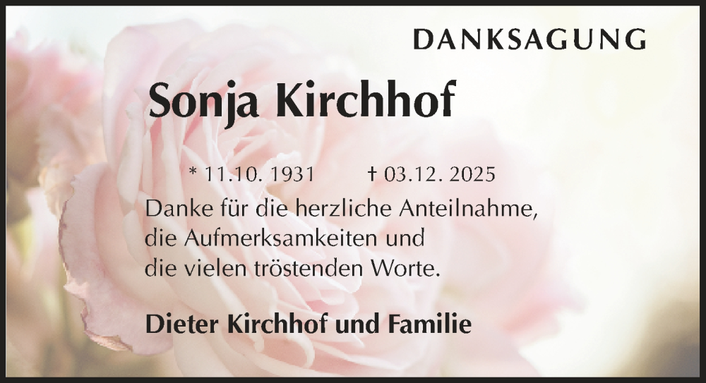Hier finden Sie alle Traueranzeigen aus der Zeitung, die bisher für Sonja Kirchhof erschienen sind. Weitere Traueranzeigen, die in der Zeitung erscheinen, werden hier ebenfalls aufgelistet