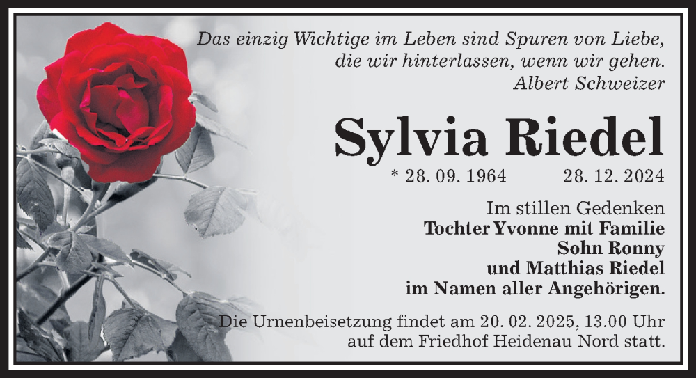 Hier finden Sie alle Traueranzeigen aus der Zeitung, die bisher für Sylvia Riedel erschienen sind. Weitere Traueranzeigen, die in der Zeitung erscheinen, werden hier ebenfalls aufgelistet