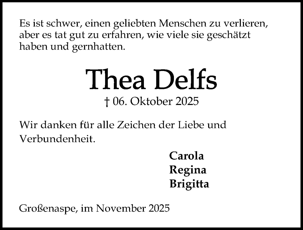 Hier finden Sie alle Traueranzeigen aus der Zeitung, die bisher für Thea Delfs erschienen sind. Weitere Traueranzeigen, die in der Zeitung erscheinen, werden hier ebenfalls aufgelistet