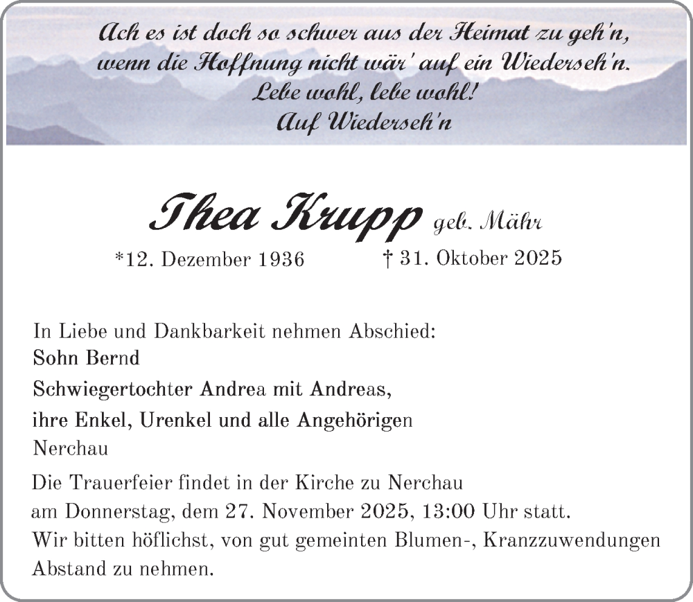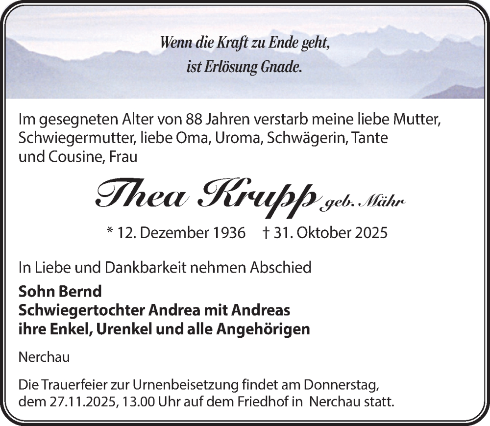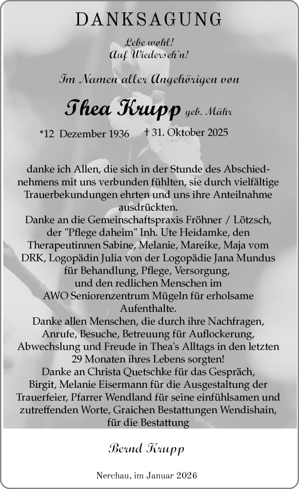 Hier finden Sie alle Traueranzeigen aus der Zeitung, die bisher für Thea Krupp erschienen sind. Weitere Traueranzeigen, die in der Zeitung erscheinen, werden hier ebenfalls aufgelistet