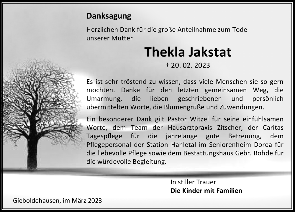 Hier finden Sie alle Traueranzeigen aus der Zeitung, die bisher für Thekla Jakstat erschienen sind. Weitere Traueranzeigen, die in der Zeitung erscheinen, werden hier ebenfalls aufgelistet