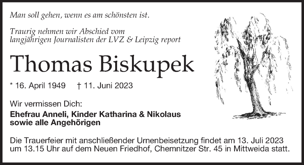 Hier finden Sie alle Traueranzeigen aus der Zeitung, die bisher für Thomas Biskupek erschienen sind. Weitere Traueranzeigen, die in der Zeitung erscheinen, werden hier ebenfalls aufgelistet