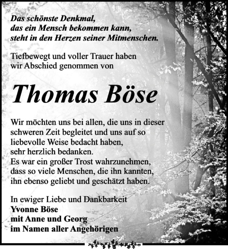 Hier finden Sie alle Traueranzeigen aus der Zeitung, die bisher für Thomas Böse erschienen sind. Weitere Traueranzeigen, die in der Zeitung erscheinen, werden hier ebenfalls aufgelistet